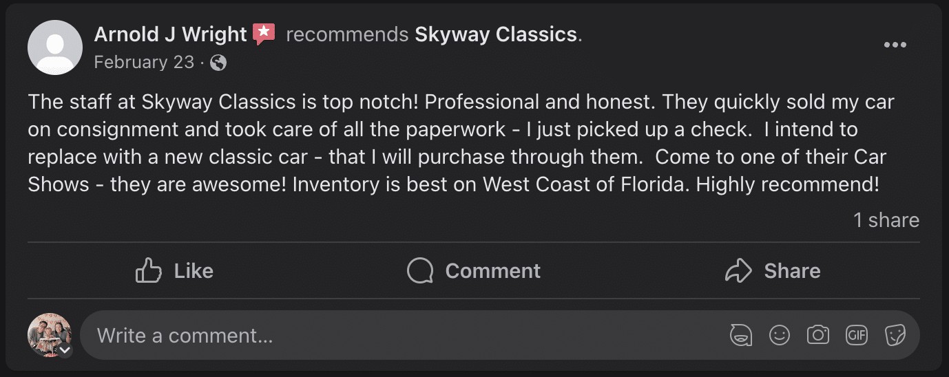 With over 200 vehicles in stock, we have something for everybody. All stored indoors and ready to be driven home or shipped! If it’s a classics, we sell it!